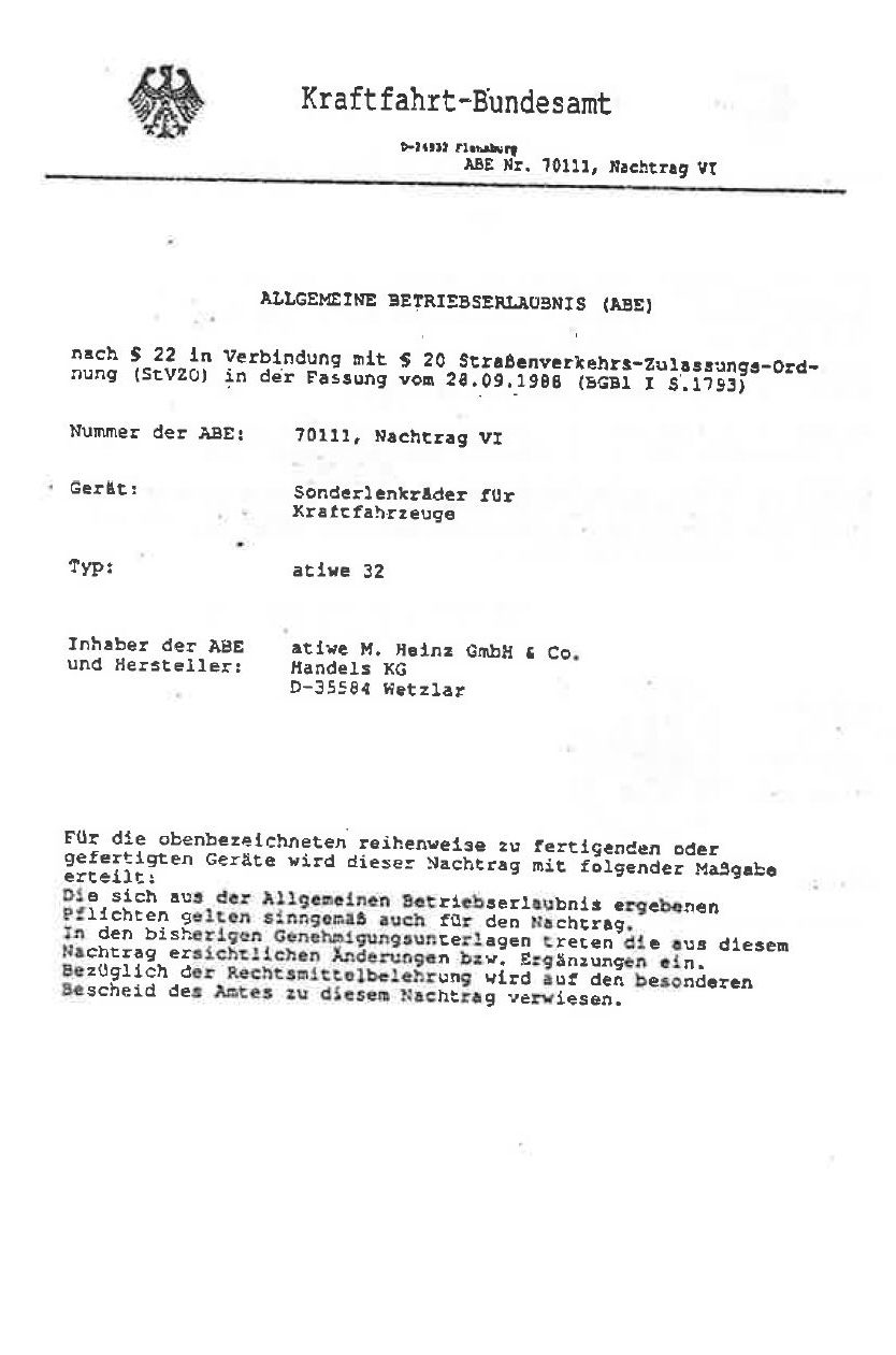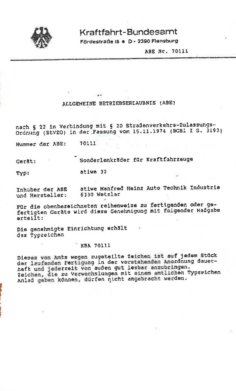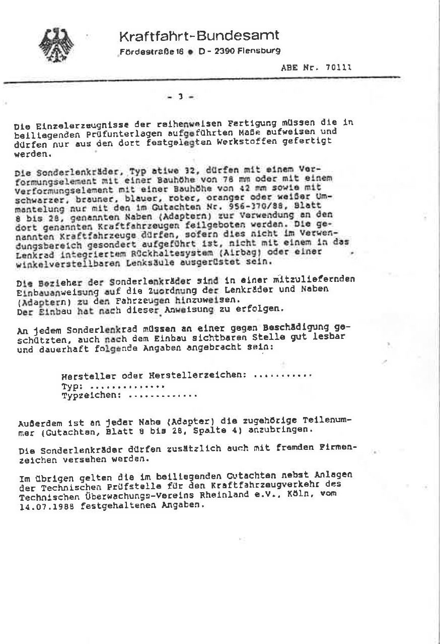 ABE für Atiwe Lenkrad Typ 32 ( KBA 70111 )